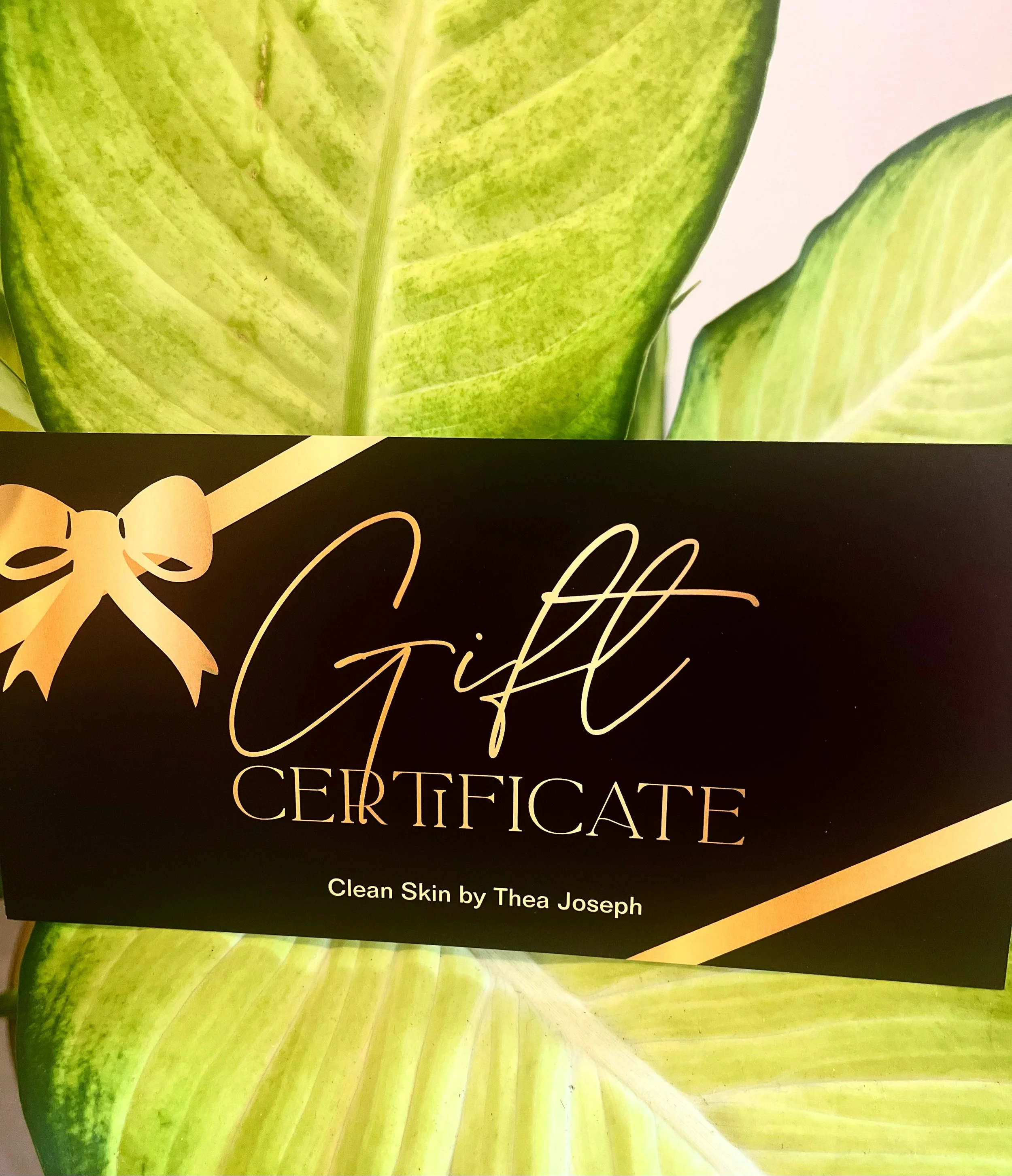 Store › Clean Skin Gift Certificate Image 1 of 1 Clean Skin Gift Certificate from $25.00 Give the gift of skincare!Treat yourself or someone else to any full body waxing service or facial service. Value: Select Value $25.00 $50.00 $75.00 $100.00 Purchase Added! Give the gift of skincare!Treat yourself or someone else to any full body waxing service or facial service.